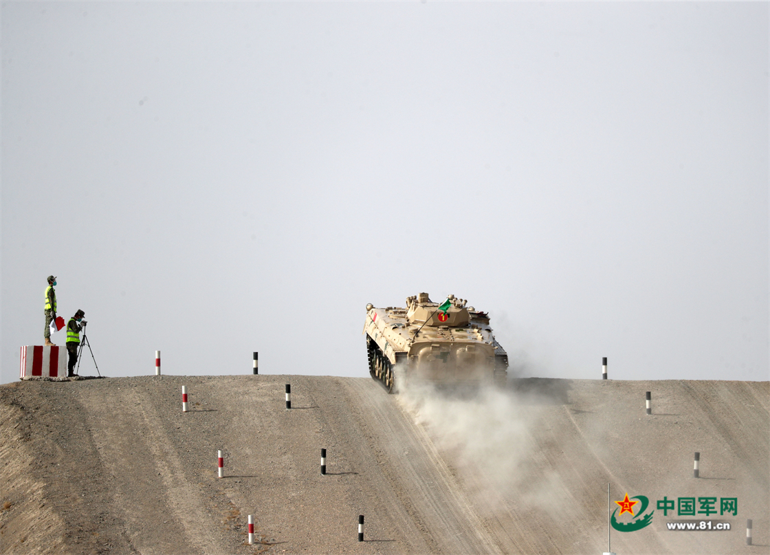 中国参赛队驾驶步战车翻越土岭。罗兴仓 摄