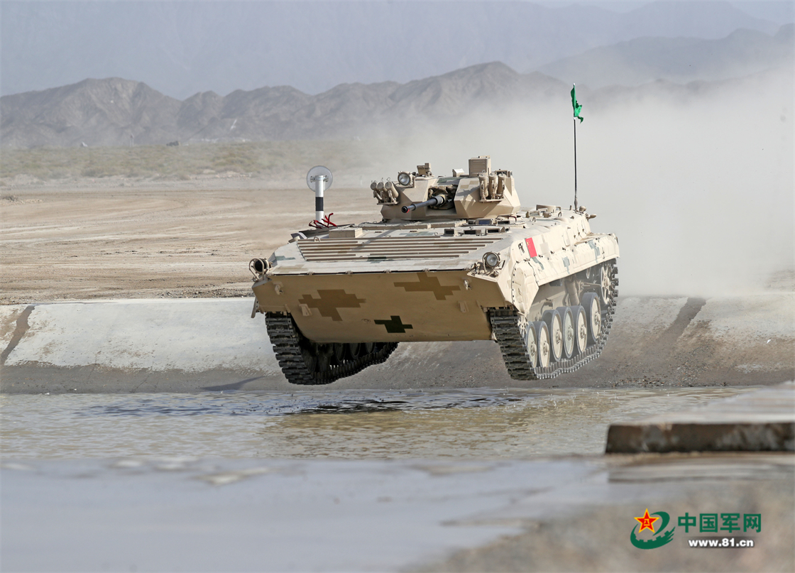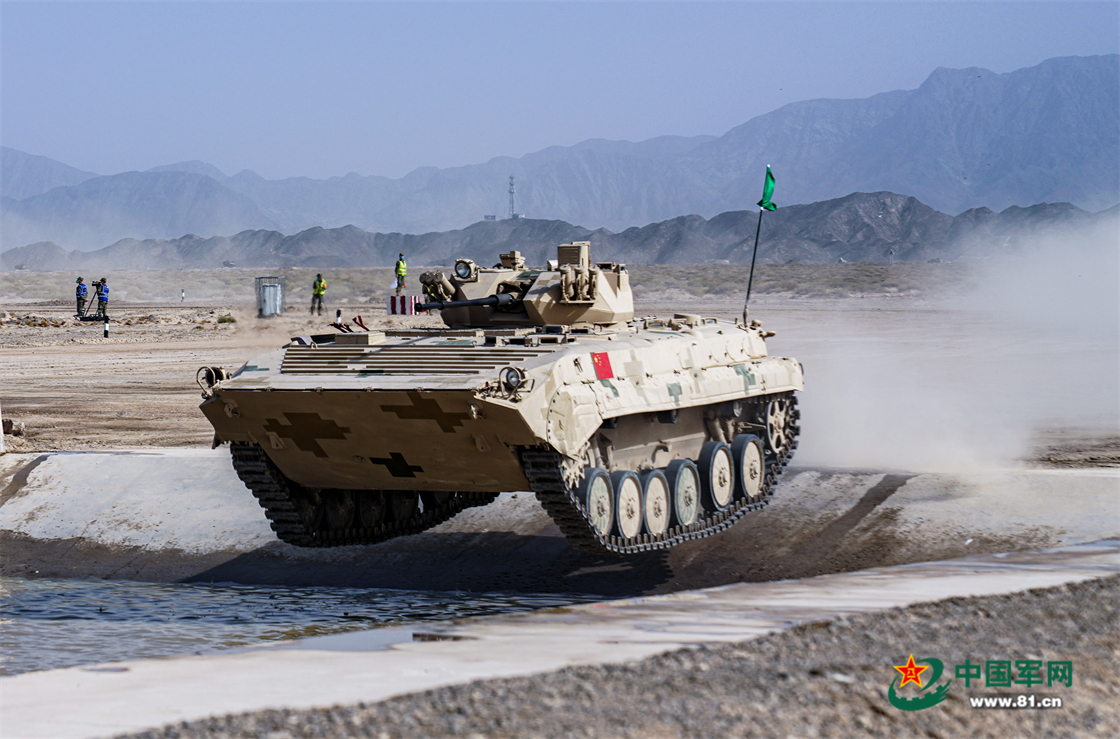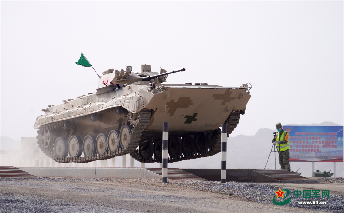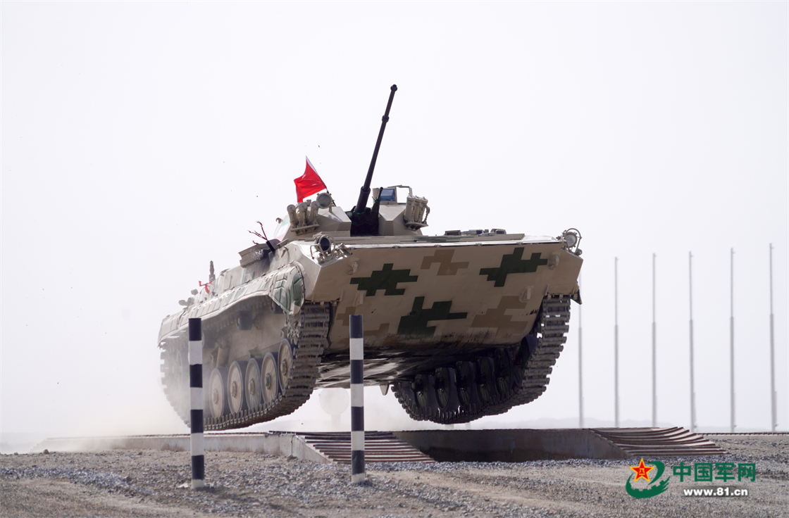 中国参赛队员驾驶步战车飞跃车辙桥。栾铖 摄