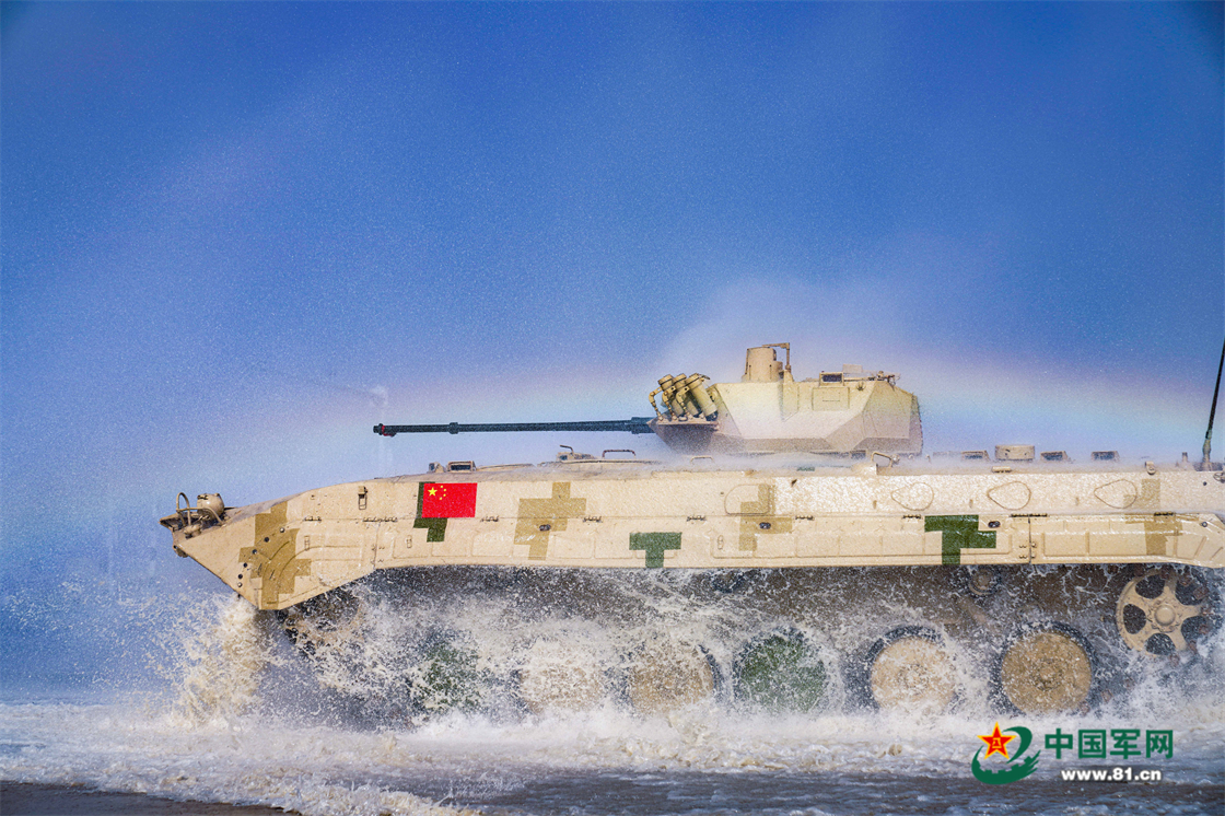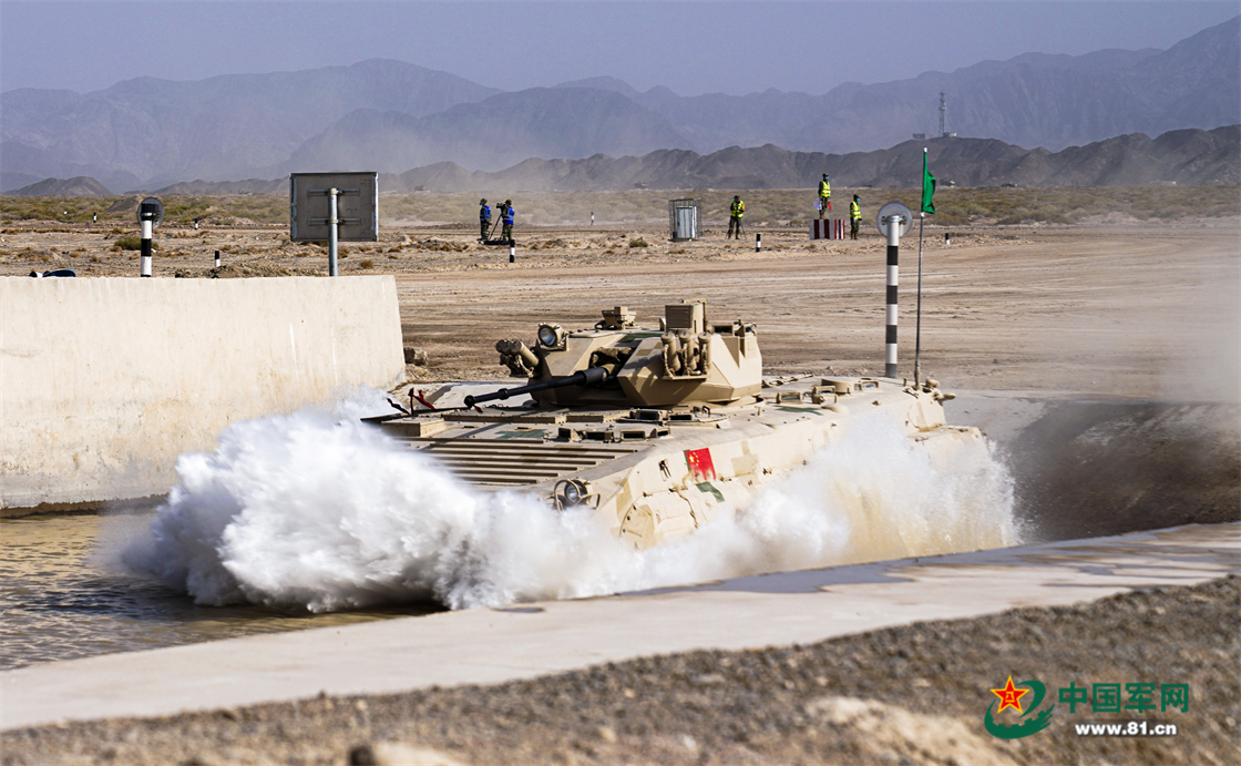 中国参赛队员驾驶步战车通过涉水场。李硕勋 摄
