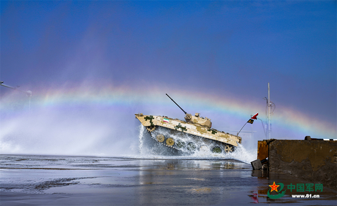 中国参赛队驾驶步战车通过涉水场。罗兴仓 摄