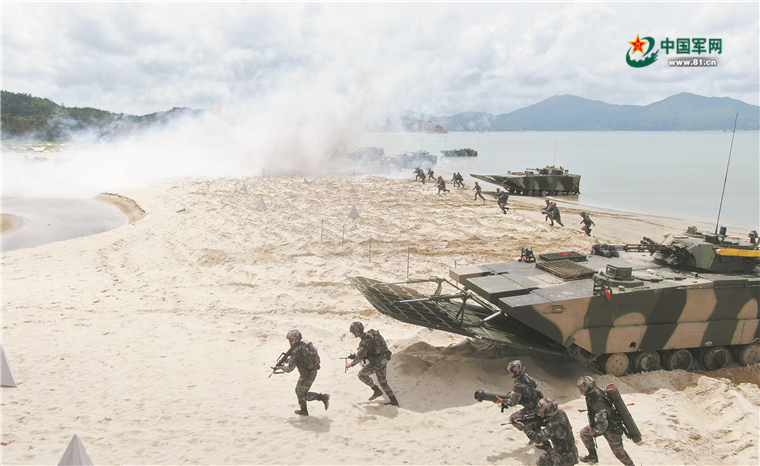 “硬骨头六连”官兵在陆海协同演练中向岸滩发起冲击。张永进摄