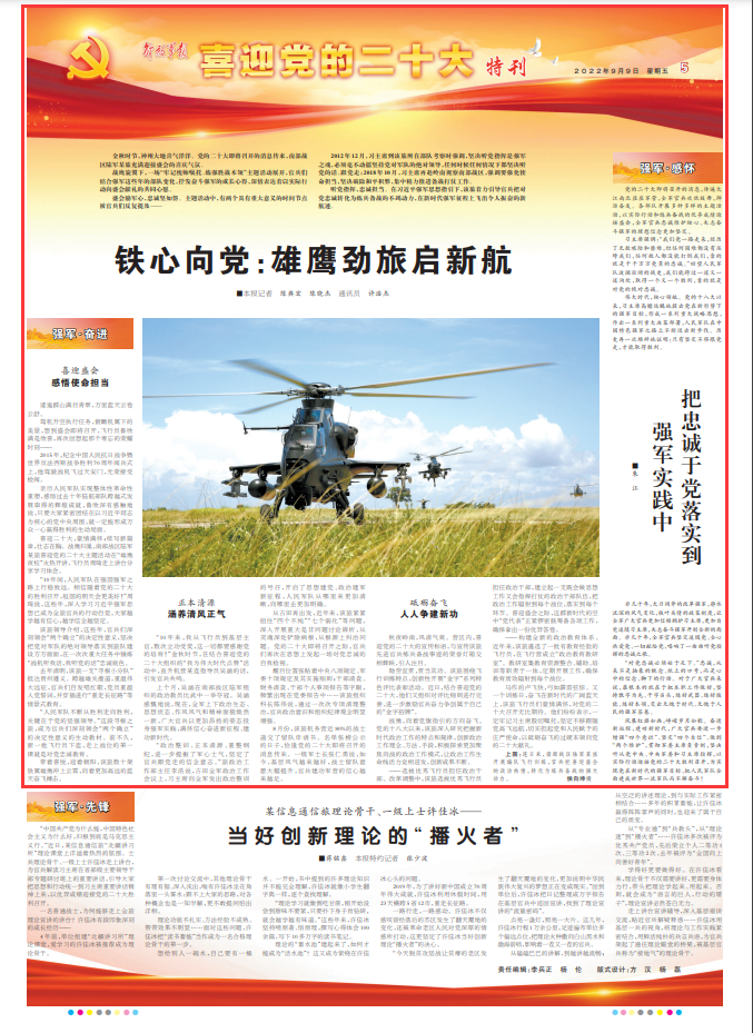 喜迎二十大,豪情满怀;续写新篇章,壮志在胸。战鹰归巢,南部战区陆军某旅喜迎党的二十大主题活动在“雄鹰夜校”火热开讲,飞行员周琦走上讲台分享学习体会。