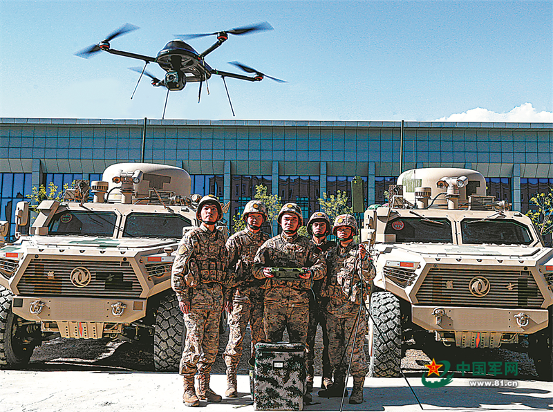 该团定向培养军士邹静奇(左三)为战友示范无人机操作。袁旖阳摄