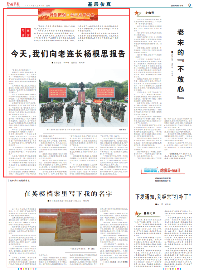 烈日下,特级英雄杨根思的雕像以向前冲锋的姿态巍然矗立。在老连长的“注视”下,官兵们满怀骄傲地汇报在这次任务中取得的新成绩。