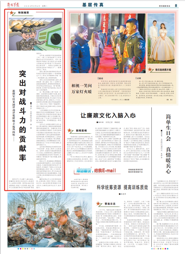 除此之外,某连副连长樊继福结合高原高寒环境特点,主动与院校教员联系,为某新型侦察车研发多个系统软件,有效提升了部队火力打击速度和精准度;某营二级上士宋洪伟,刻苦钻研智能化知识,参与完成全团指挥控制信息化装备联调联试,为建立多维立体侦察感知体系作出重要贡献……