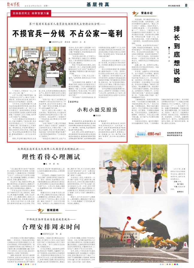 虽然战友们讨论的都是“三五元钱”的琐事,申延帅却听得非常仔细,并将情况整理后报告给机关相应科室。