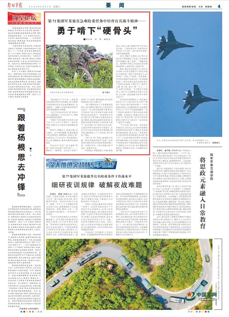 “气为兵神,勇为兵本。面对新的形势任务,我们比以往任何时候都更加需要培育血性胆气,确保在直面强敌时能战善战、勇当尖兵。”该旅领导说,他们将用好急难险重任务这块“磨刀石”,立足复杂情况作筹划、构设险难环境抓训练,在实兵演训、战备执勤中把练技战术与练胆量血性结合起来,磨砺官兵永不言弃、绝不服输的顽强意志,培塑勇于攻坚、不怕牺牲的英雄气概。