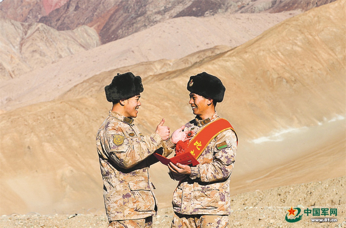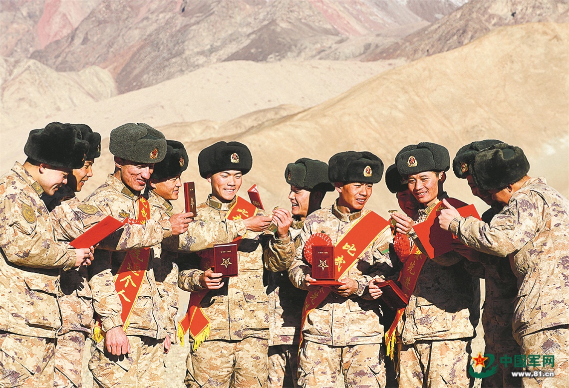 冬日高原,暖阳映照笑脸。戈壁驻训场上,几名战士围拢在身披绶带、手捧奖章的战友身边,为他们点赞祝贺。