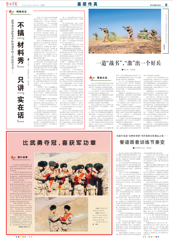 手捧三等功奖章,某班班长、一级上士严涛笑得格外灿烂。此前,他两次参加比武竞赛,均未取得好名次。严涛没有气馁,认真总结失利原因,训练更加刻苦。此次比武,他一举夺得狙击课目冠军。