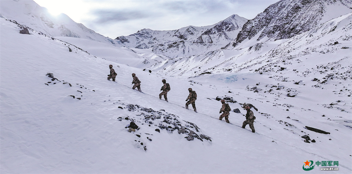 天空湛蓝,朔风卷起地面上的积雪,打在脸颊上如刀割般痛。“我走前面!”入伍11年,已在这条路上跋涉百余趟的二级上士徐景超,是连队公认的“爬坡王”和“活地图”。昨夜下过一场大雪后,巡逻路走起来异常艰难。徐景超小心翼翼在前面探路,身后几名战友踩着他的脚印,在茫茫雪原上缓缓前行。