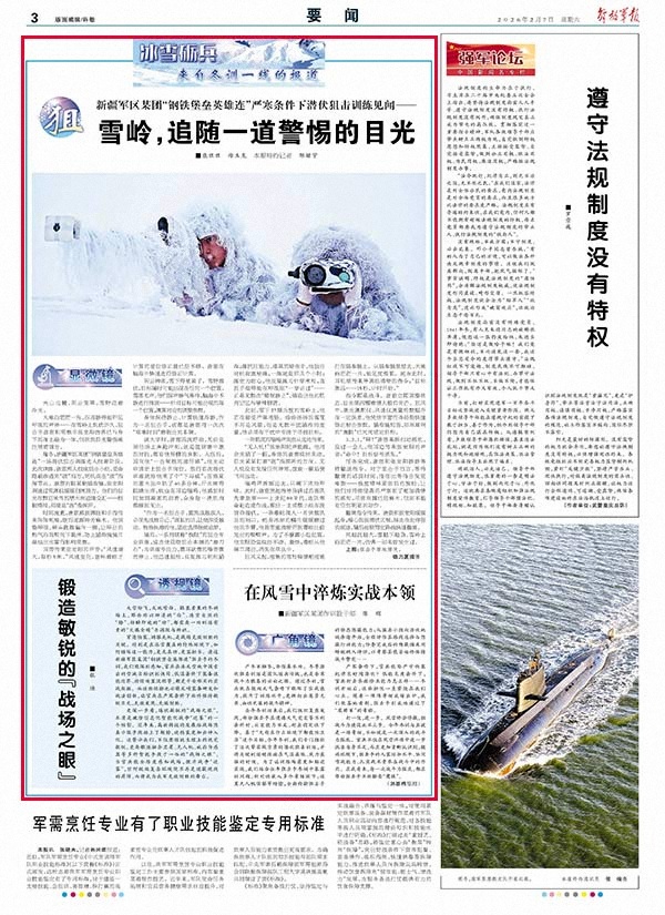 穿透伪装、洞察先机,是战场克敌制胜的关键。特别是在冰雪覆盖的特殊环境下,如何锤炼这一能力,更见真功、更显担当。透过新疆军区某团“钢铁堡垒英雄连”狙击手的冬训,我们能深刻感知,官兵在冰天雪地中摸索出的雪地目标识别诀窍、低温条件下装备性能边界、特情处置流程等,都是千金难买的实战数据。而这些经验也必将反哺装备研发和战法创新,让官兵在严寒条件下始终保持敏锐目光,先敌发现、先敌制胜。
