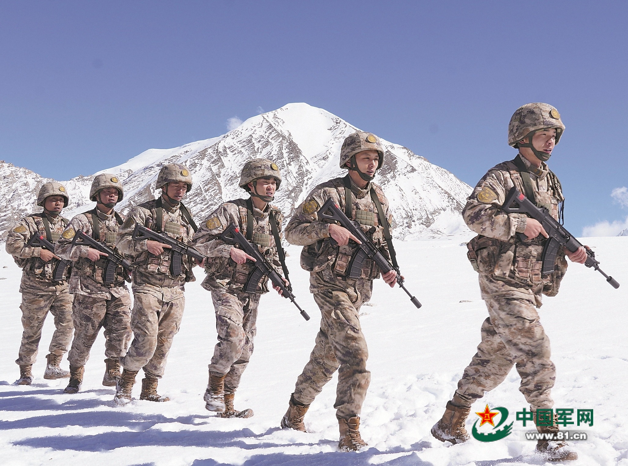 隆冬时节,清晨的第一缕阳光铺满雪山,西藏军区某部日屋边防连巡逻分队官兵整装待发。