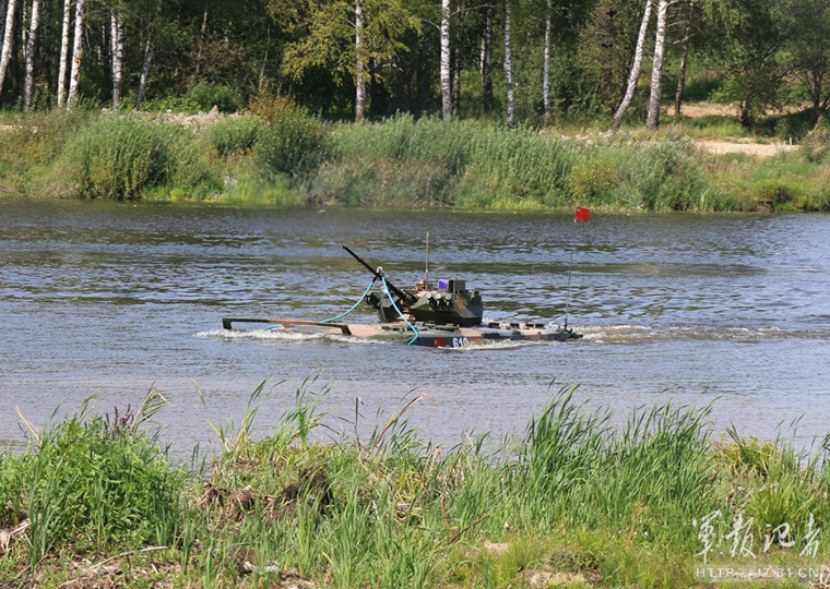 参加“苏沃洛夫突击”比赛的中国战车在水上浮渡。