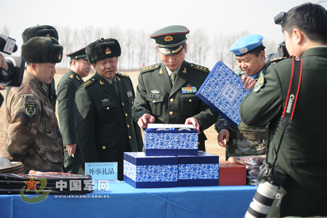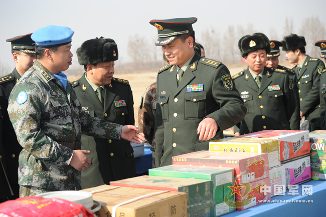 现场解说人员向首长介绍:为了确保在完成施工任务的同时,顺利通过联利团装备核查,维和大队组建以来,他们一边与国外维和分队保持密切联系,了解掌握车辆装备最新情况,一边积极筹划采购备用零部件。针对任务区高温多雨的实际情况,他们还给每一名维和官兵购买了气垫、睡袋、MP4等生活必需品。