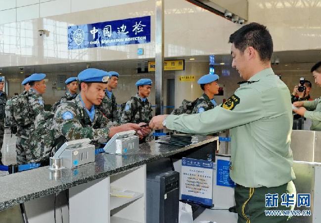 维和部队官兵在长春边检站办理出境手续。新华社记者 张楠 摄