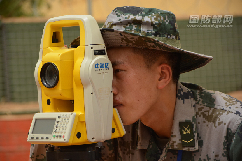 在接近50摄氏度的地表温度下,官兵用全站仪认真测量,早已汗流浃背。