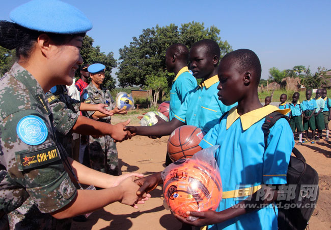 赴南苏丹维和步兵营官兵给学生们带来了急需的文体用品。