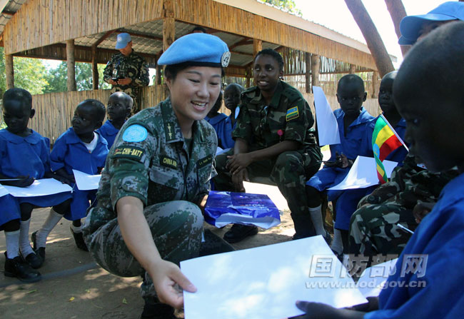 赴南苏丹维和步兵营官兵和当地的孩子们