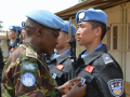 在这里,我们与寂寞为伴,但是为了明天的幸福,我们无怨无悔。祖国人民为我们托起不落的太阳,让我们用浪花般的激情,礁石般的意志,随着太阳去远航,追寻蓝色的梦想,维护和平献青春,肩负使命写忠诚。为了完成维和任务,我们将在这里并肩战斗。