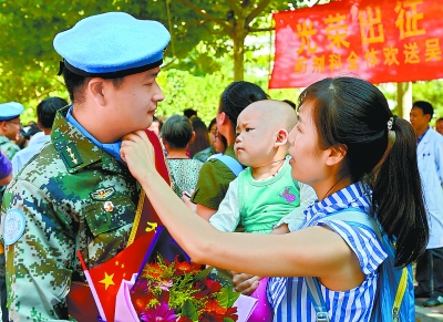 9月7日,解放军白求恩国际和平医院赴利比里亚维和医疗分队队员罗涛的妻子为准备出征的丈夫整理军装。当日,我国第18批赴利比里亚维和医疗分队首批23名队员光荣出征,执行维和任务。 新华社发