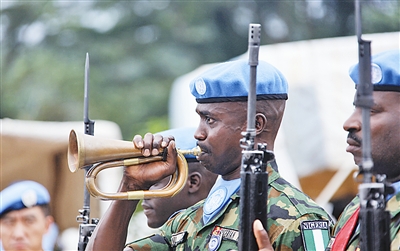 尼日利亚士兵在检阅式上吹响小号,欢迎来访的中国官兵。