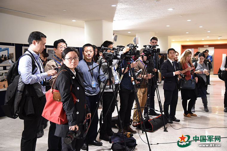 包括联合国官方电台、联合国新媒体等在内的十多家国际传媒记者正在采访拍摄展览开幕式。 中国军网记者 柳军 摄
