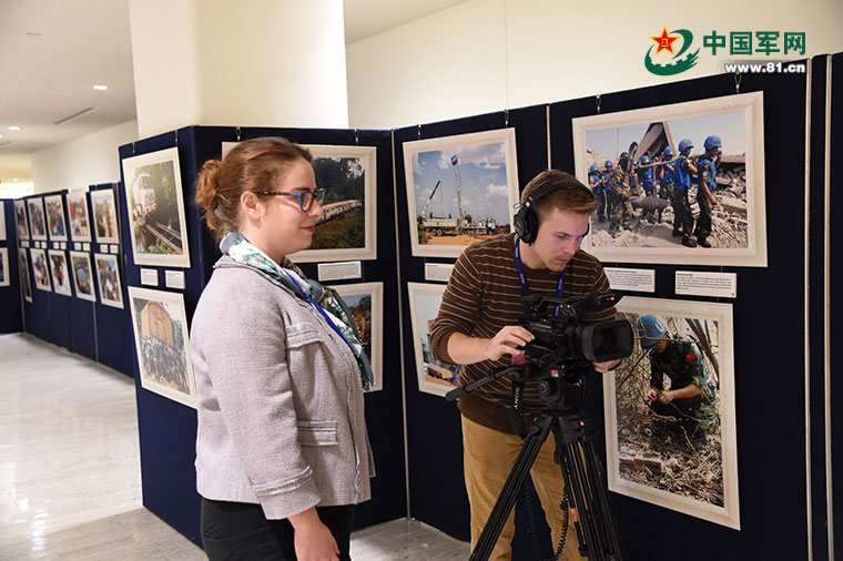参加展览开幕式的国际传媒记者仔细拍摄展出的维和精彩图片。 中国军网记者 柳军 摄