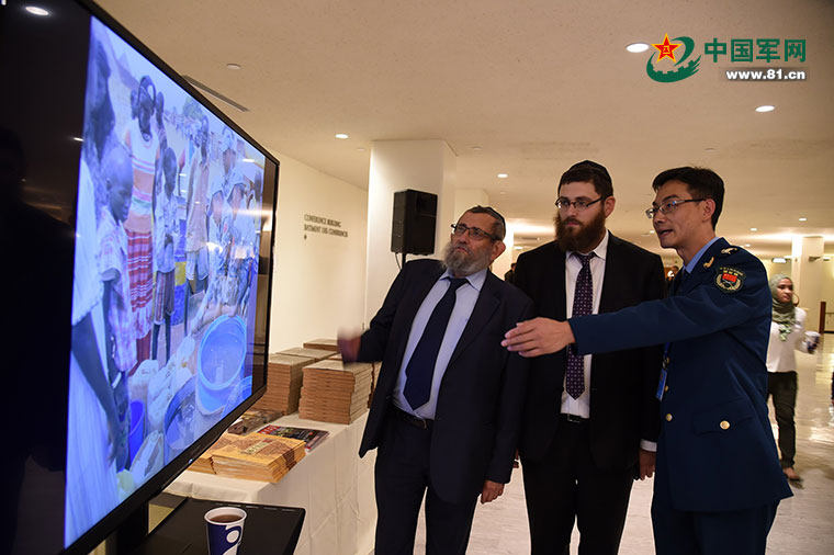 联合国工作人员听取“为和平而来——中国参加联合国维和行动25周年图片展”介绍。中国军网记者 柳军 摄