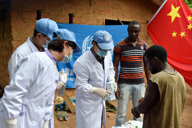 11月1日,在利比里亚绥德鲁市附近村庄,中国第18批赴利比里亚维和部队医疗分队医生为当地村民义诊。