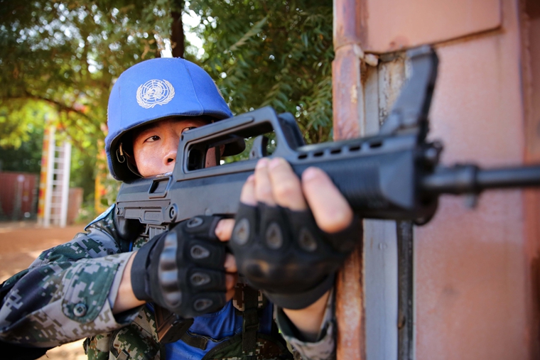 在马里加奥中国第3批赴马里维和部队营区,一名警卫分队一中队战士在实弹战术演练中持枪警戒。潘思危 摄