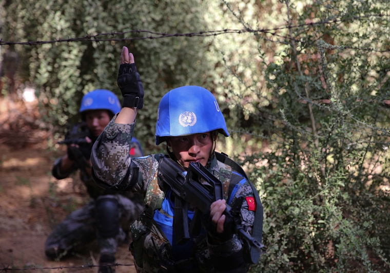 在马里加奥中国第3批赴马里维和部队营区,警卫分队一中队的班长周连军(前)在实弹战术演练中前进。潘思危 摄