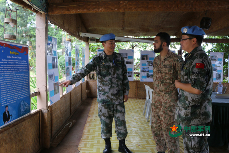 我维和分队指挥长刘维(左一)热情介绍图片展情况。李子科摄