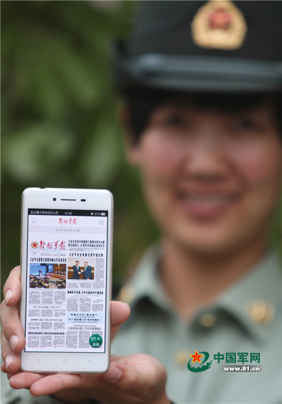 9月30日,第16集团军某旅女兵正在使用智能手机,登录沈阳军区“学雷锋微博”和《解放军报》客户端查看当天的新闻。该旅根据总部有关规定,结合部队实际,制定了智能手机管理措施和使用办法,确保官兵业余时间安全上网、科学上网。 翁伟立摄