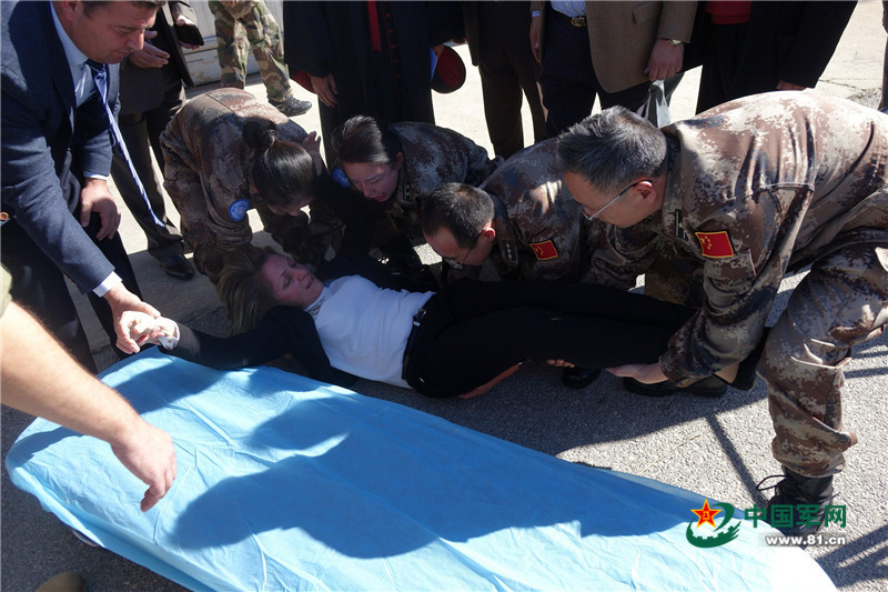 中国赴黎维和医疗分队人员将马伊娜抬上担架。 魏柯帆摄