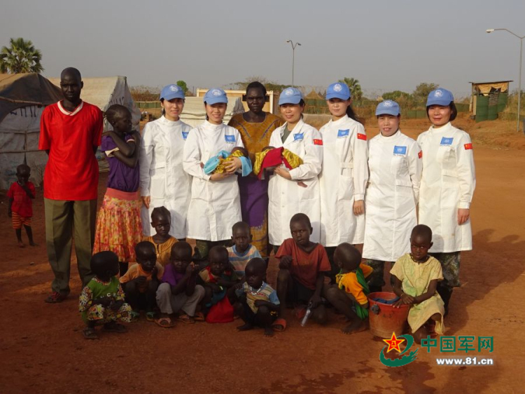 三八妇女节当日,医疗队参与接生的女同志一起到难民营看望产妇和“吉祥”“如意”。李秋泽 摄