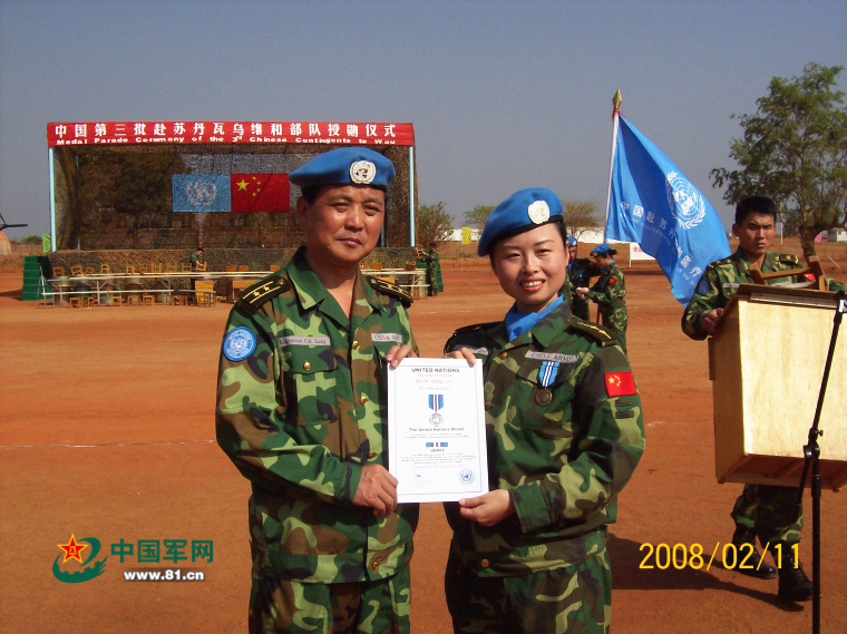 中国第三批赴苏丹瓦乌维和部队副指挥长张勇(左)和队员甄玉改。