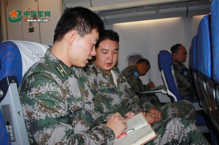 记者吕德胜(左一)在飞往任务区的飞机上采访维和战士。