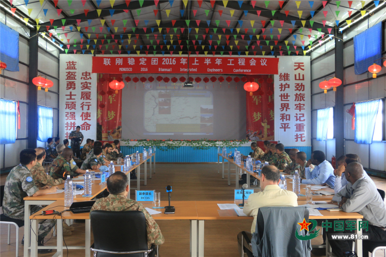 当地时间5月5日至6日,联刚稳定团2016上半年工程会议在“中国半岛”召开,此次会议由联刚稳定团戈马总部组织,我第19批赴刚果(金)维和工兵分队承办,联刚稳定团副参谋长、民事工程处处长、戈马工程处处长、战勤处处长以及任务区内6支工兵分队的指挥长等相关人员参加。