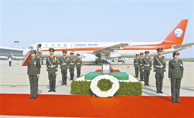 军乐队奏响中华人民共和国国歌,在机场上空久久回荡。两名女兵向烈士敬献花环,全场人员向英雄三鞠躬,表达深切哀悼和崇高敬意。