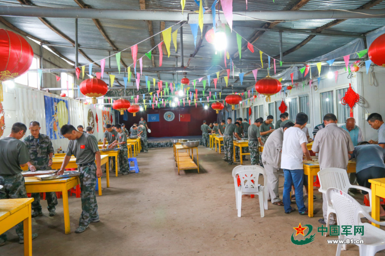 饭堂里,维和官兵围成一桌,你用生疏的动作和面,他用自制擀面杖擀皮,一边包着饺子一边讲述着关于冬至的故事,欢声笑语连成一片。