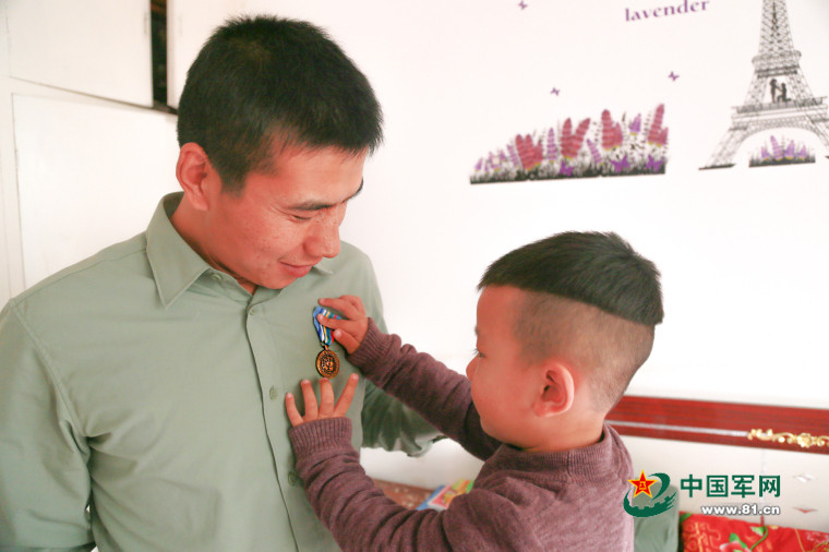 爸爸,你戴着和平荣誉勋章的样子真帅!来,让本宝宝给你再戴一次。