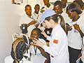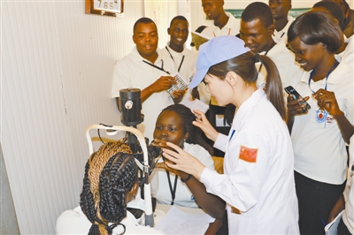 中国赴南苏丹维和医疗分队近日与当地健康培训学校结成帮扶对子,为该校提供医疗帮带服务。分队官兵讲解并演示了重症监护室的工作流程及心电图机、呼吸机、除颤仪等设备的使用方法,同时组织学生进行实践操作,提高他们的临床技能。图为中国军医刘艳红(前排右一)正在讲解眼科医疗仪器的使用方法。马青峰 摄