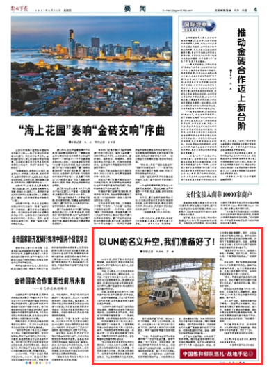 根据联合国规定,在通过初始和装备两项核查后,中国维和官兵便可以履行蓝盔使命,驾机翱翔在达尔富尔的天空。请关注今日出版的《解放军报》的详细报道——