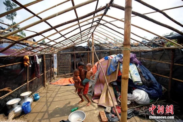 一个小罗兴亚难民抱着两个更小的孩子在被风暴摧毁的房屋里。(图片来源:中国新闻网)