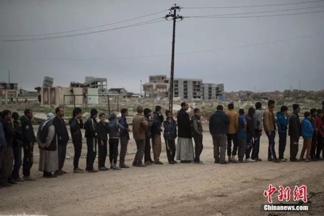 伊拉克摩苏尔难民排队领取食物和救援物资。(图片来源:中国新闻网)