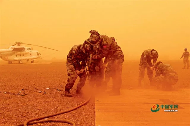 中国赴马里维和部队官兵在沙尘暴中紧急展开加奥机场直升机停机坪建设任务。