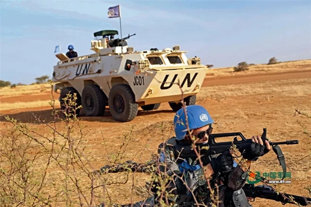 中国赴马里维和部队官兵执行武装巡逻任务。