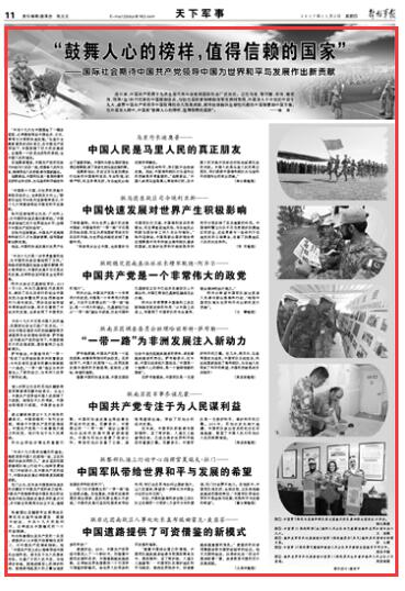 连日来,中国共产党第十九次全国代表大会受到国际社会广泛关注。正在马里、黎巴嫩、苏丹、南苏丹、刚果(金)执行任务的中国维和官兵,与驻在国政要和维和友军交流时发现,外国友人十分关注中共十九大,盛赞中国共产党领导中国取得的非凡发展成就,期待能够解决全球性问题的中国智慧和中国方案。在外国友人眼中,中国是“鼓舞人心的榜样,值得信赖的国家”。请关注今日《解放军报》的报道——