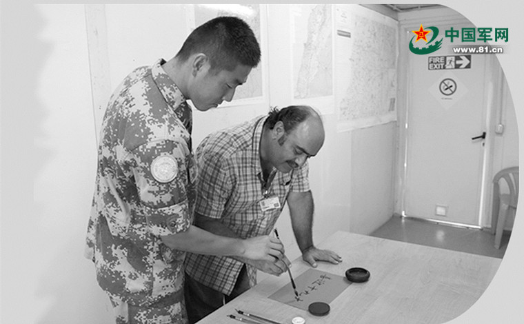 中国第16批赴黎巴嫩维和建筑工兵分队官兵教联合国雇员书写汉字。周洪宇 摄