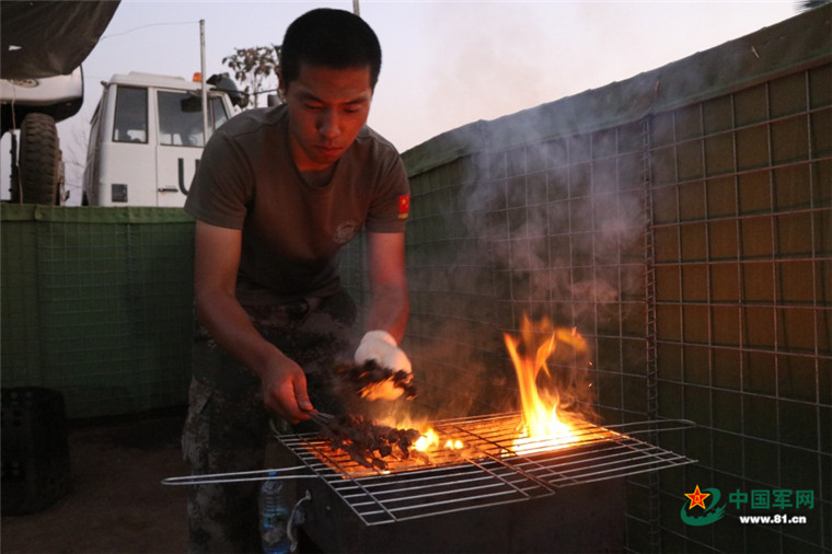维和步兵营某长巡分队炊事班战士因地制宜进行烧烤。时成帅 摄